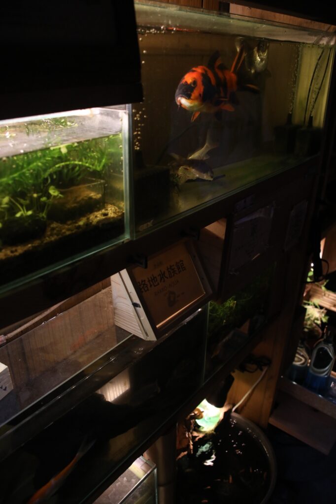 1m程の狭い道の両端に所狭しと並べられた水槽では金魚や鯉など色鮮やかな魚たちが悠々と泳いでいる。