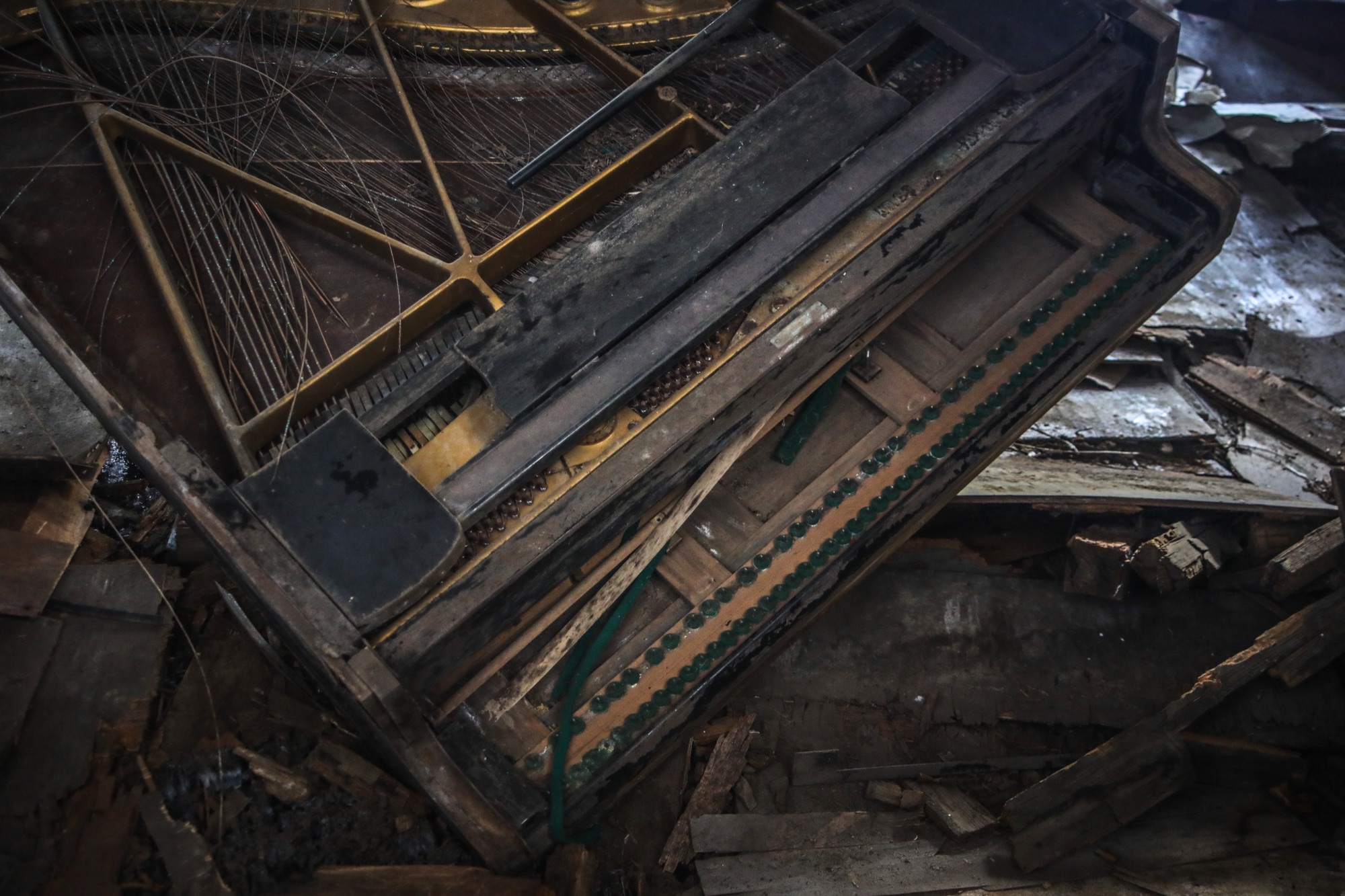 長年の雨漏りと冬の湿気に晒され続けた床はとうに腐り落ち、自重を支えきれなくなったピアノは、まるで地面に吸い込まれるように沈み込んでいます。