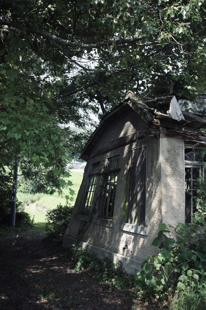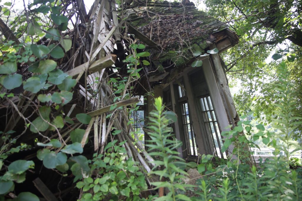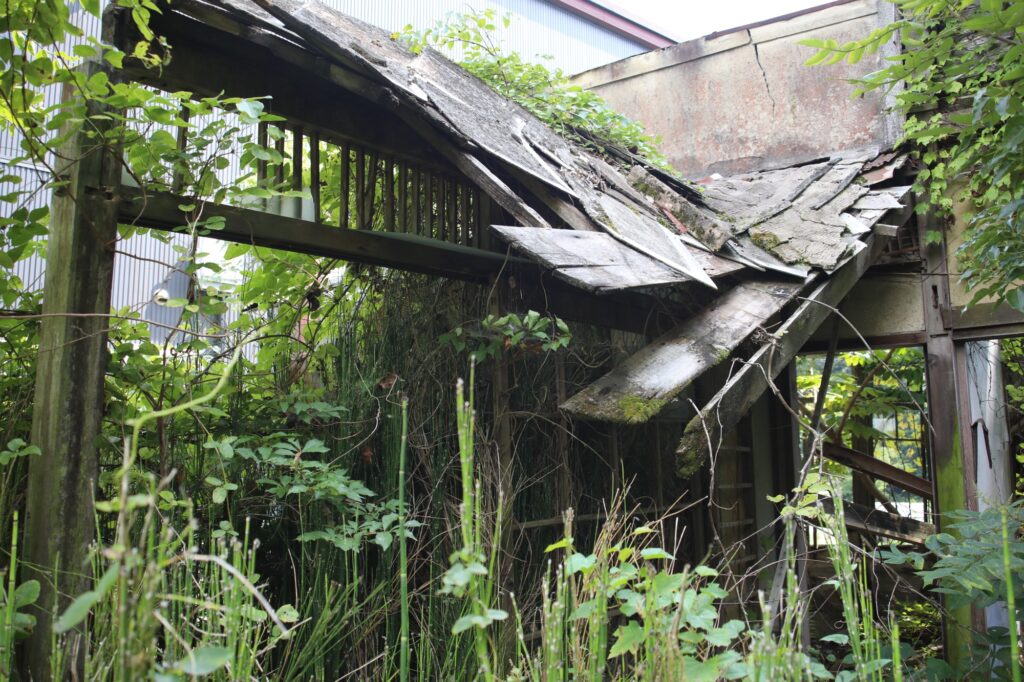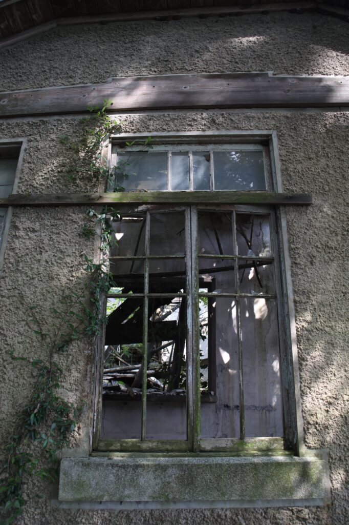 誰も管理しなくなるとどんなに立派な建物でも傾いてしまうが、ここまで傾いても放置されている建物は珍しい。こういう建物の中に入るのは非常に危険なので、さすがに中まで探索するのは断念した。