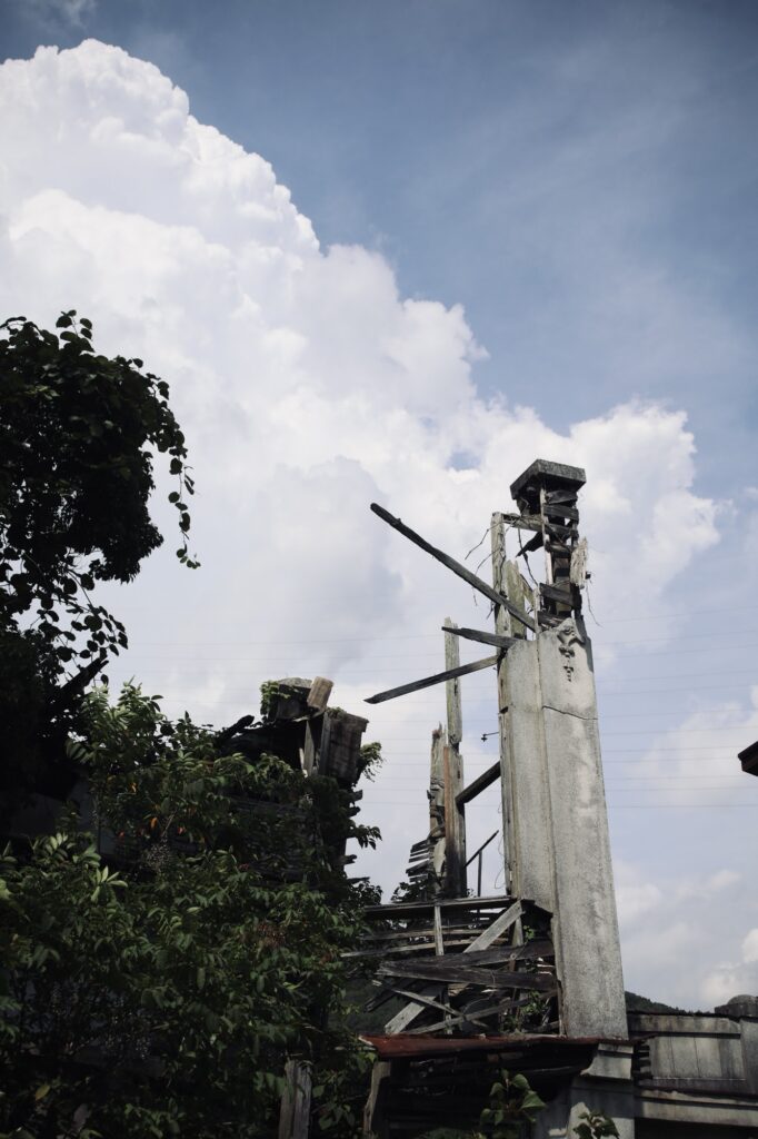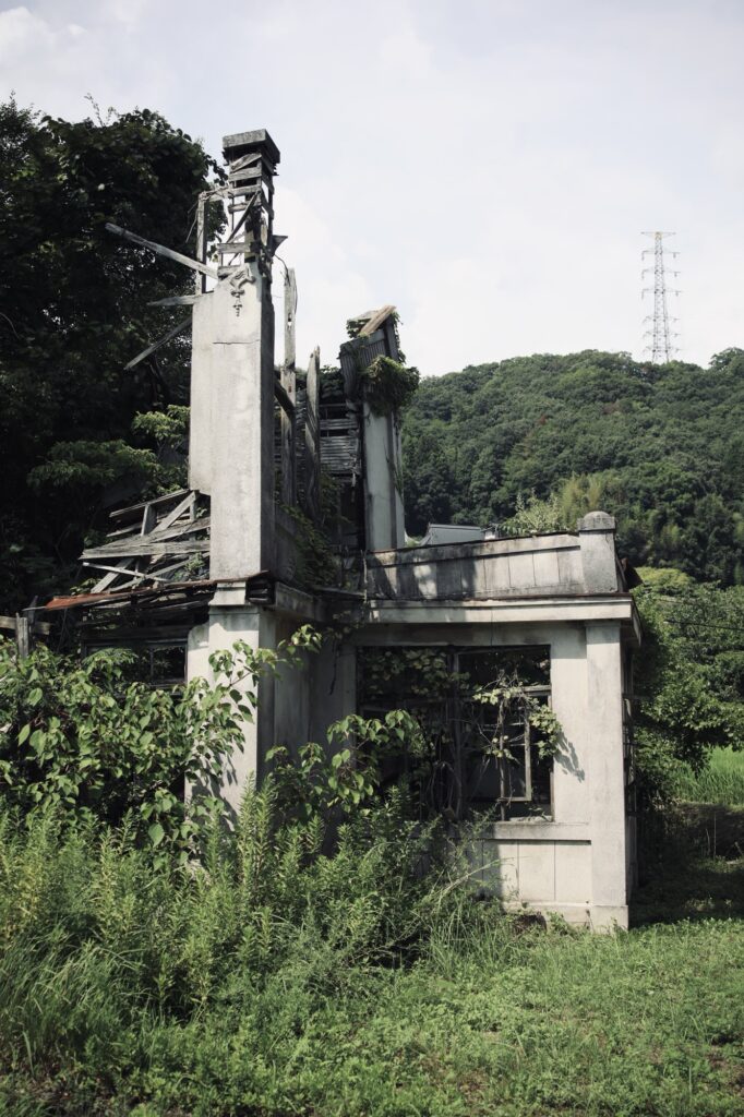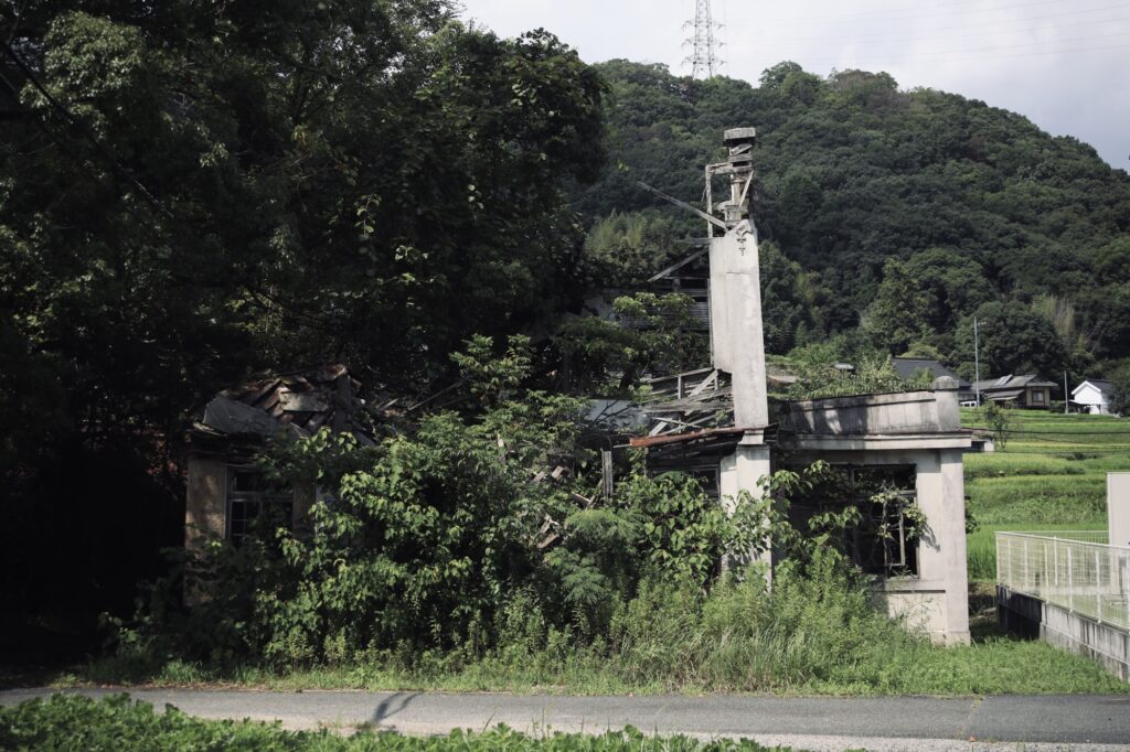 こうして見ると改めて建物ごと大きく傾いていることがわかる。一昔前までは二階部分もある程度は残っていたらしいが、今となっては二階部分は完全に消滅し、一階部分ですら崩壊が進んでいるため完全に崩れ去ってしまう日もそう遠くない。訪れるなら早い方が良いかもしれない。