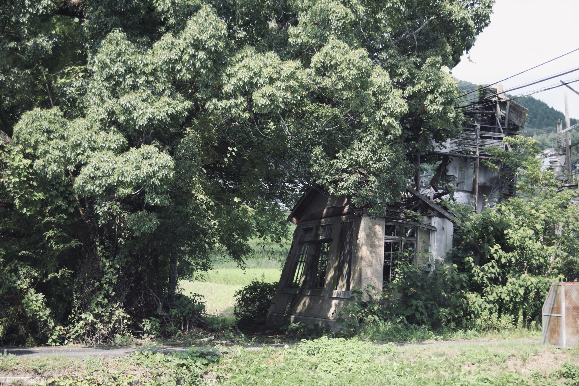 誰も管理しなくなるとどんなに立派な建物でも傾いてしまうが、ここまで傾いても放置されている建物は珍しい。こういう建物の中に入るのは非常に危険なので、さすがに中まで探索するのは断念した。