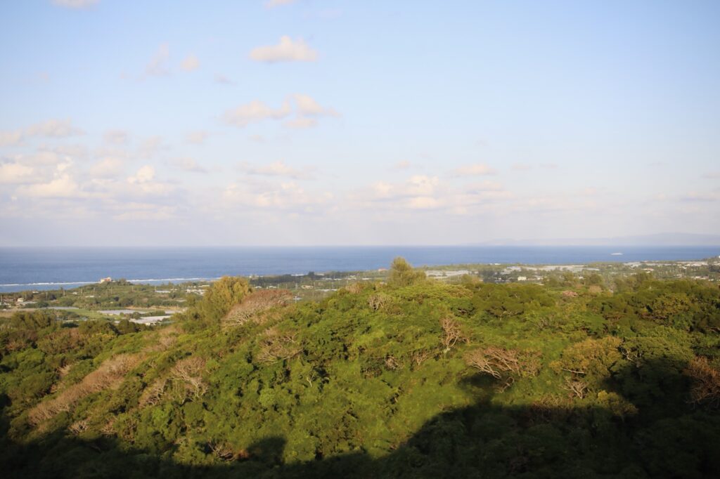 しばらく登ると本丸跡に到達する。ここからは沖縄の海と山を一望できた。