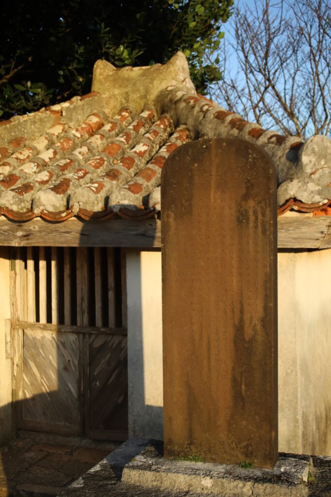 1749年に今帰仁の監守であった今帰仁按司十世宣謨(せんも)が首里王府から今帰仁城の永代管理と典礼を司ることを許されたことを記念して建てられた石碑。数百年前の石碑がこれほど綺麗な状態で残されているのは珍しいのではないか。