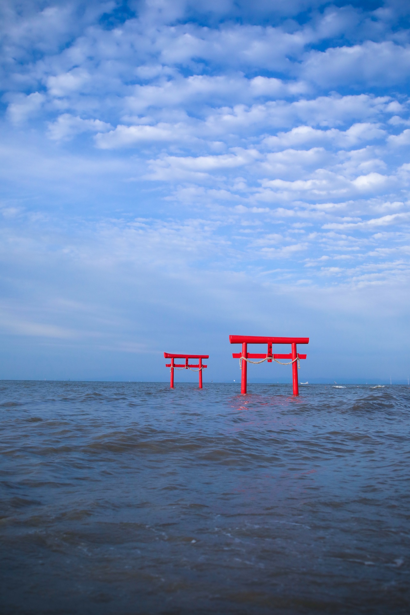 日本最大級の干満差を誇る有明海に建てられた鳥居だが、干潮時は鳥居を歩いて潜れるものの満潮時は海に沈んでしまう。